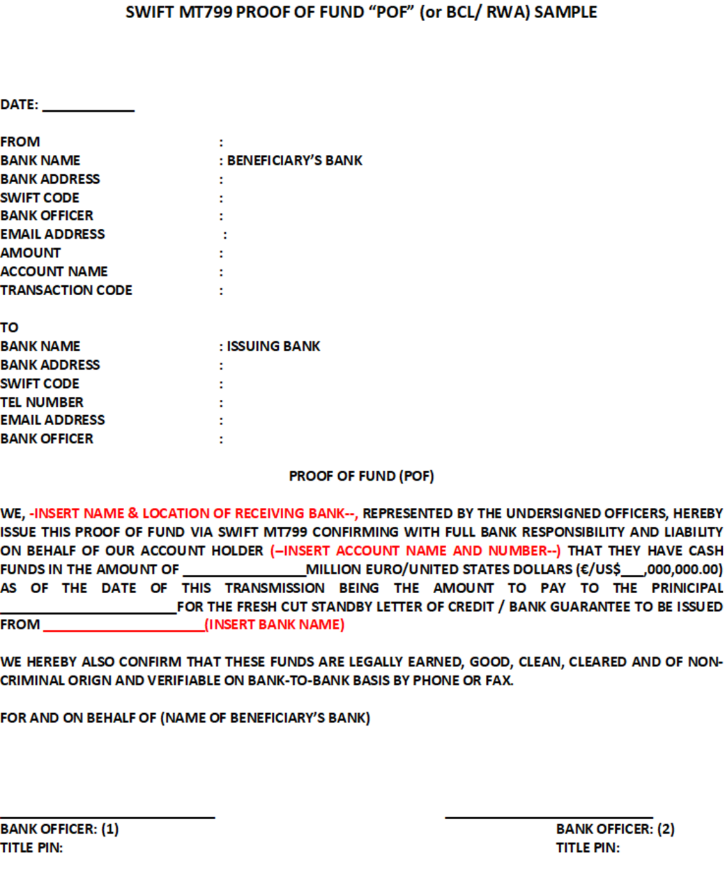 Swift Mt799 Proof Of Fund For Sblc Bg Standby Letter Of Credit
